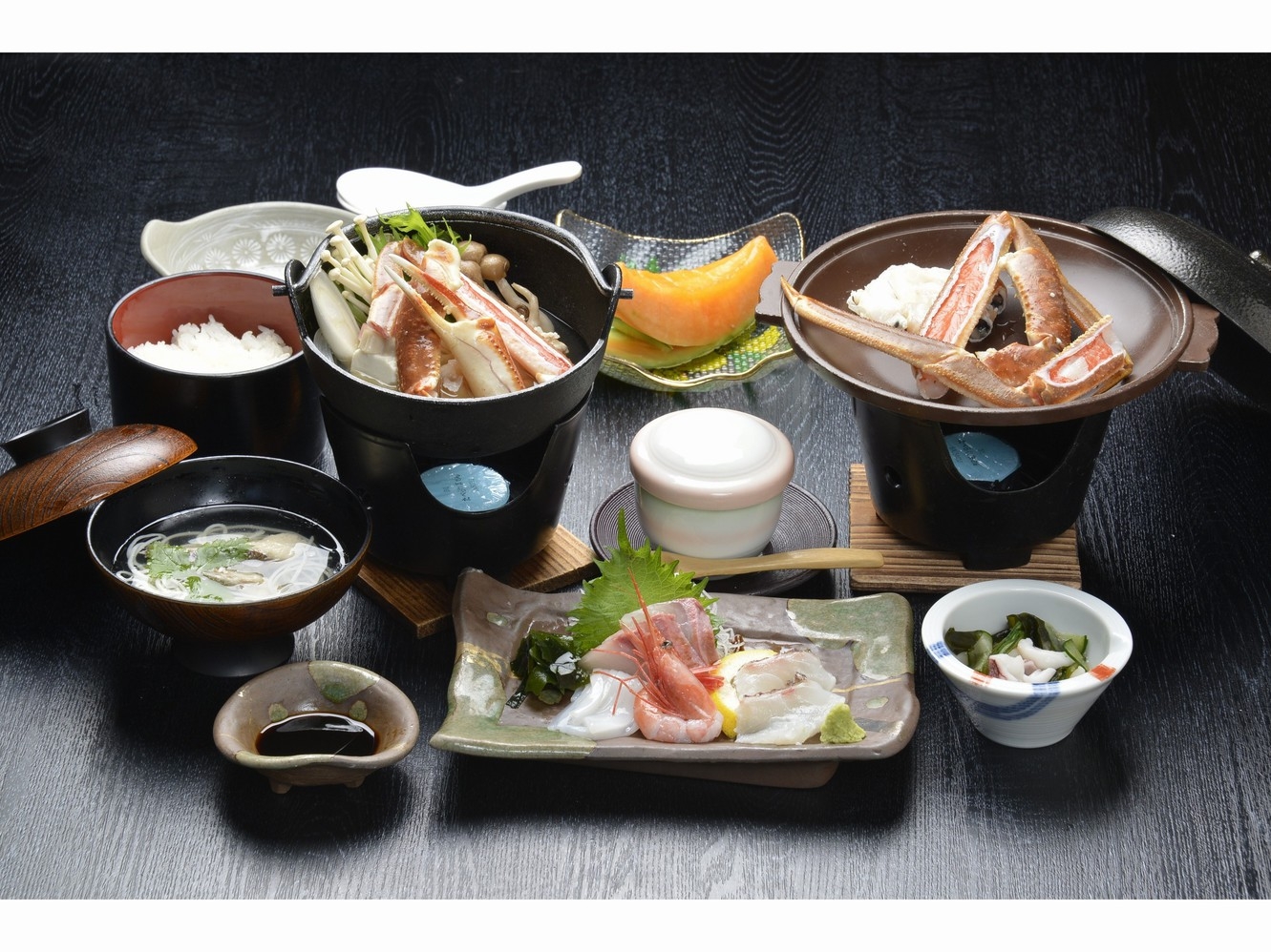 あつあつで香ばしいかにの炭火焼と、親がにでだしを取ったかにすき、ゆでがに、かに刺し、地元の新鮮な刺身盛合せなどが付きます。
