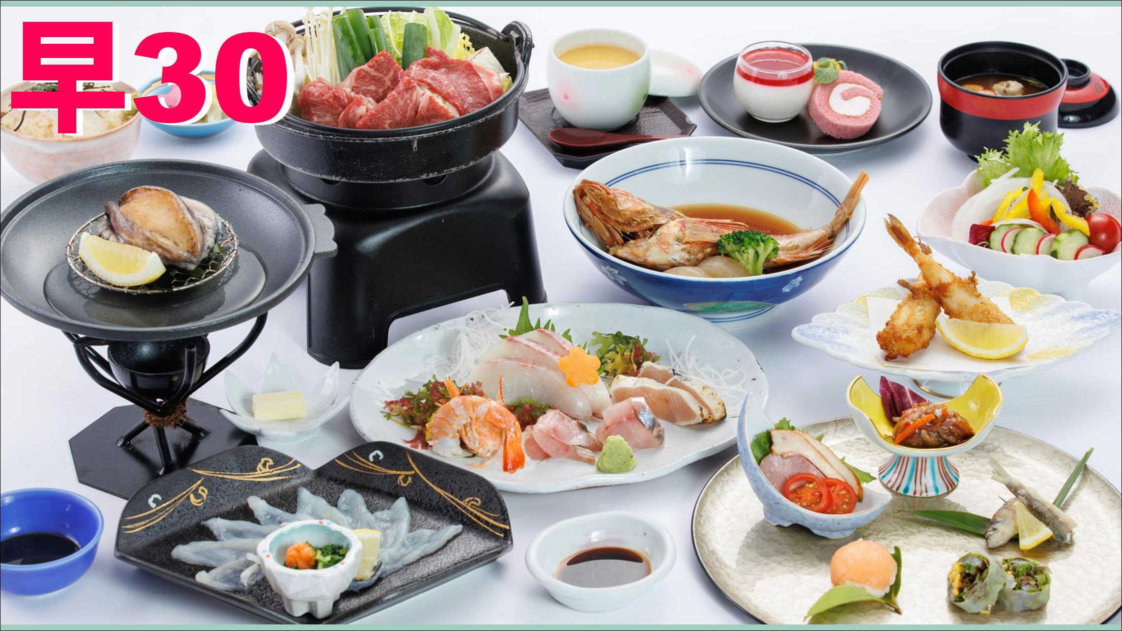 長萩和牛、あわび、ふく刺しのついたよくばりなプラン。