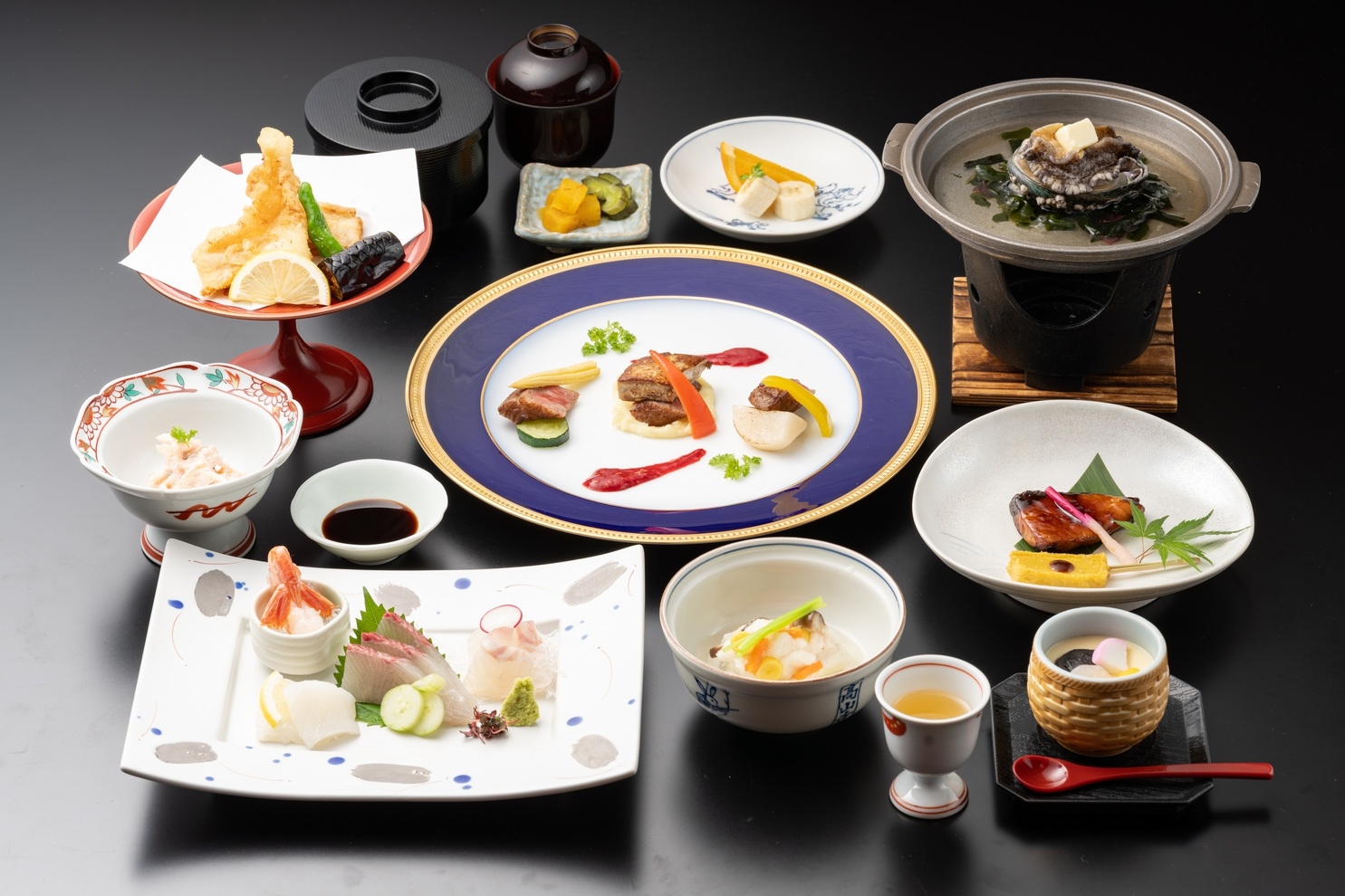 食前酒/梅酒、先附け/河豚皮の真砂揚げ、御造り/四種盛り、蓋物/鯛のかぶら蒸し、焼物/ぶりの照り焼き、洋皿/国産和牛とフォアグラのラズベリーソース仕立て、台の物/鮑の踊り焼き、揚物/虎河豚アラ唐揚げ、蒸物/茶碗蒸し、御飯/山口県産米、味噌汁、香の物、季節のフルーツ