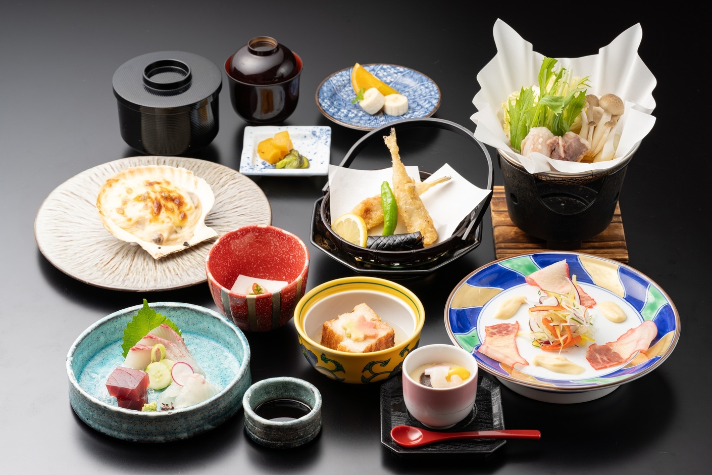 先附け/嶺岡豆腐、御造り/三種盛り、蓋物/蟹博多、サラダ/鯨のベーコン、焼物/天然帆立のグラタン、台の物/鮟鱇鍋、揚物/小ふくの唐揚げ、蒸物/茶碗蒸し、御飯/山口県産米、味噌汁、香の物、季節のフルーツ