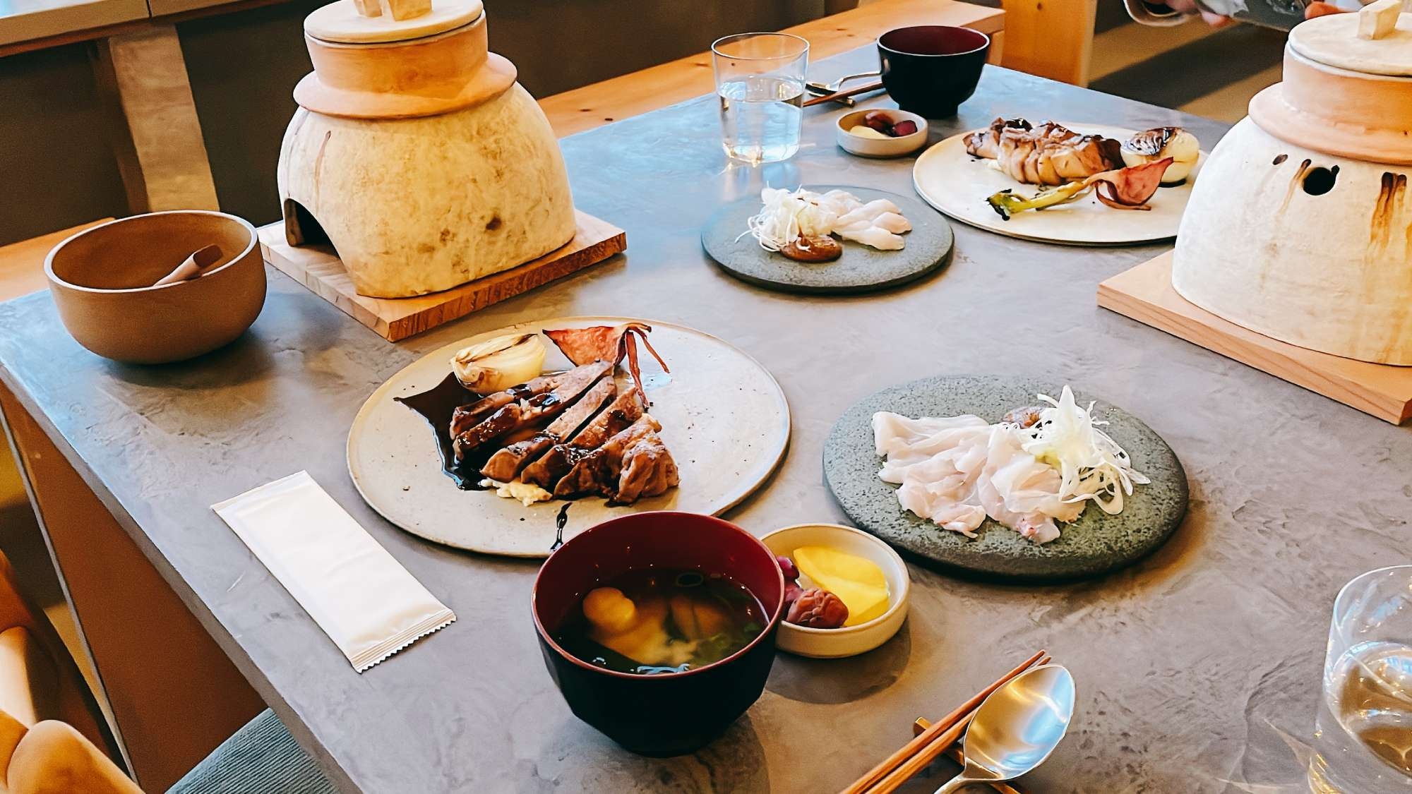 魚介の釜めし、ハンバーグ、地魚のポワレ、サラダ、副菜、お味噌汁